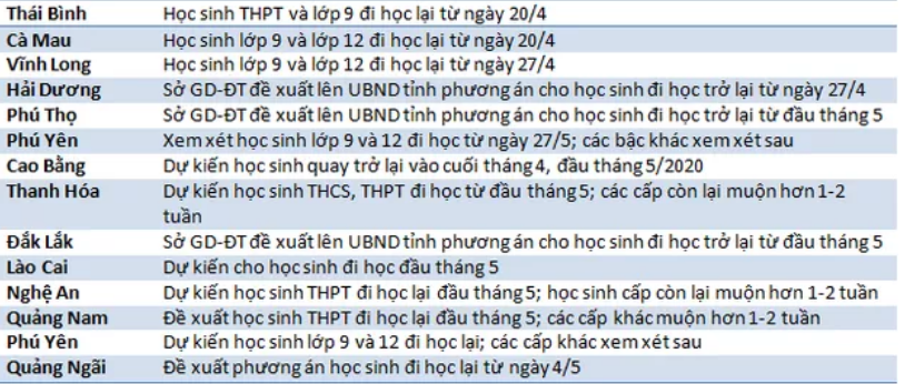Một số tỉnh thành khác đã chốt thời gian đi học lại vào ngày 27/4. Một số tỉnh hiện đang xem xét và dự kiến cho học sinh đi học lại vào cuối tháng 4, đầu tháng 5.