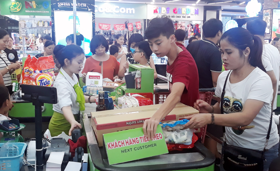 Chiều ngày 2/9 tại siêu thị Big C Thăng Long, Trung tâm thương mại Vincom, AEON trong tình trạng khách hàng chen chân mua sắm. Mặt hàng được người tiêu dùng tìm mua nhiều nhất chủ yếu là những mặt hàng tiêu dùng thiết yếu như thực phẩm, nước mắm, dầu ăn, xà phòng...Lượng khách hàng đông đúc khiến khu vực quầy thu ngân người tiêu dùng xếp hàng dài chờ thanh toán ước tính mỗi khách chờ cả nửa tiếng đồng hồ mới đến lượt thanh toán.