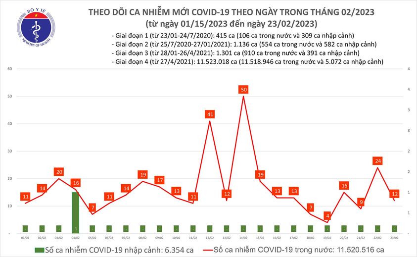 Ngày 23/2, Bộ Y tế cho biết có 12 ca mắc mới COVID-19, giảm nhẹ so với ngày trước đó. Hôm nay đã 54 ngày Việt Nam không ghi nhận ca tử vong do COVID-19.