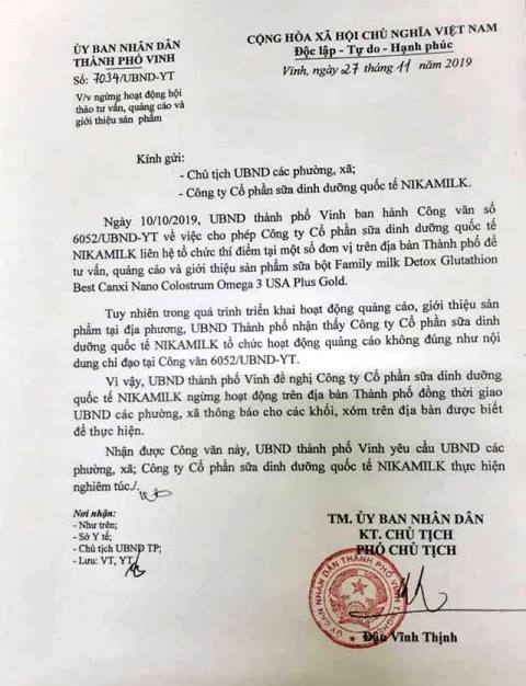 Trước đó, ngày 10/10/2019 UBND thành phố Vinh đã ban hành Công văn số 6052/UBND-YT về việc cho phép Công ty sữa Nikamilk liên hệ tổ chức thí điểm tại một số đơn vị trên địa bàn thành phố để tư vấn, quảng cáo và giới thiệu sữa bột Family milk Detox Glutathione Best Canxi Nano Colostrum Omega 3 USA Plus Gold.