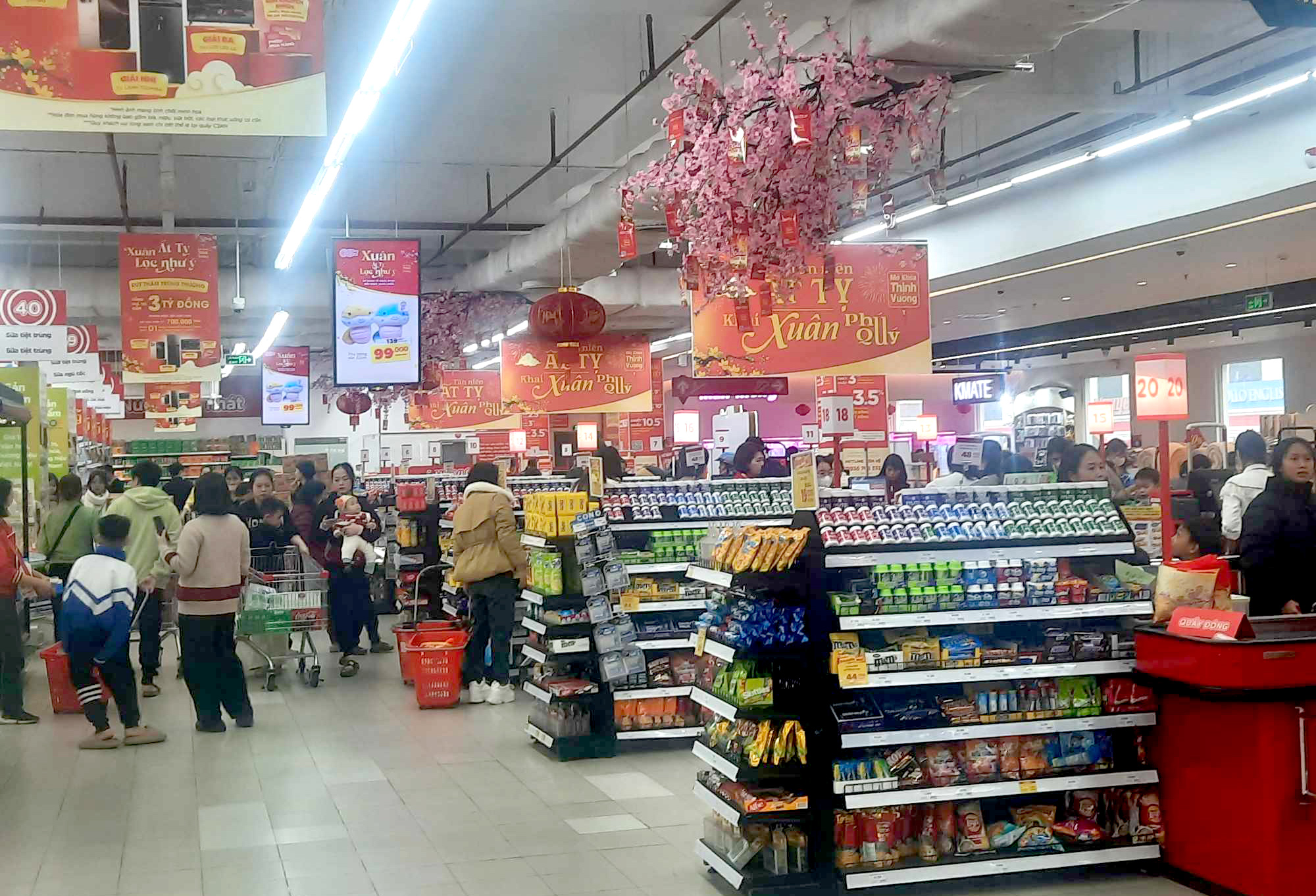 Với nguồn cung hàng hoá phong phú, các siêu thị bảo đảm đáp ứng nhu cầu mua sắm của người tiêu dùng, đồng thời thực hiện nhiều chương trình khuyến mại hấp dẫn đã tạo nên bầu không khí mua sắm rộn ràng dịp cận Tết. Ảnh: Thái Đạt