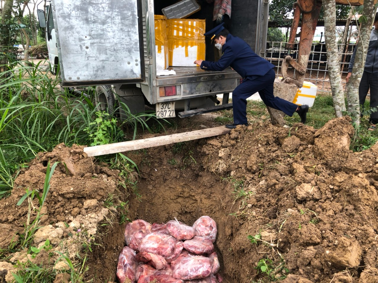 Cơ quan chức năng tiến hành tiêu huỷ số hàng hoá 850 kg thực phẩm gồm: 800 kg thịt lợn cắt khúc, 50 kg thịt gà theo quy định của pháp luật.