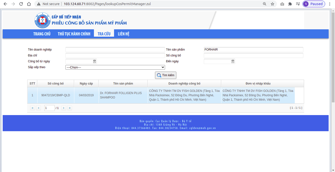 Qua tìm hiểu, sản phẩm nói ở trên có tên đầy đủ là: Dr. FORHAIR FOLLIGEN PLUS SHAMPOO do Công ty TNHH TM DV FISH GOLDEN (địa chỉ: tầng 1, Tòa nhà Packsimex, số 52 Đông Du, phường Bến Nghé, quận 1, TP.HCM) là đơn vị nhập khẩu, công bố với Cục Quản lý Dược để phân phối tại thị trường Việt Nam.