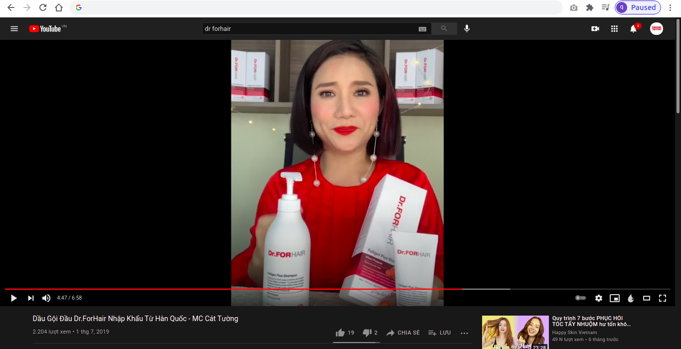 Ngoài ra, cũng tại kênh Youtube “NguonHangSi", xuất hiện video nữ diễn viên Cát Tường thổi phồng công dụng cho sản phẩm dưới tên gọi “dầu gội phục hồi, ngăn ngừa rụng tóc Dr.FORHAIR” với những lời tương tự. Trích nguyên văn: