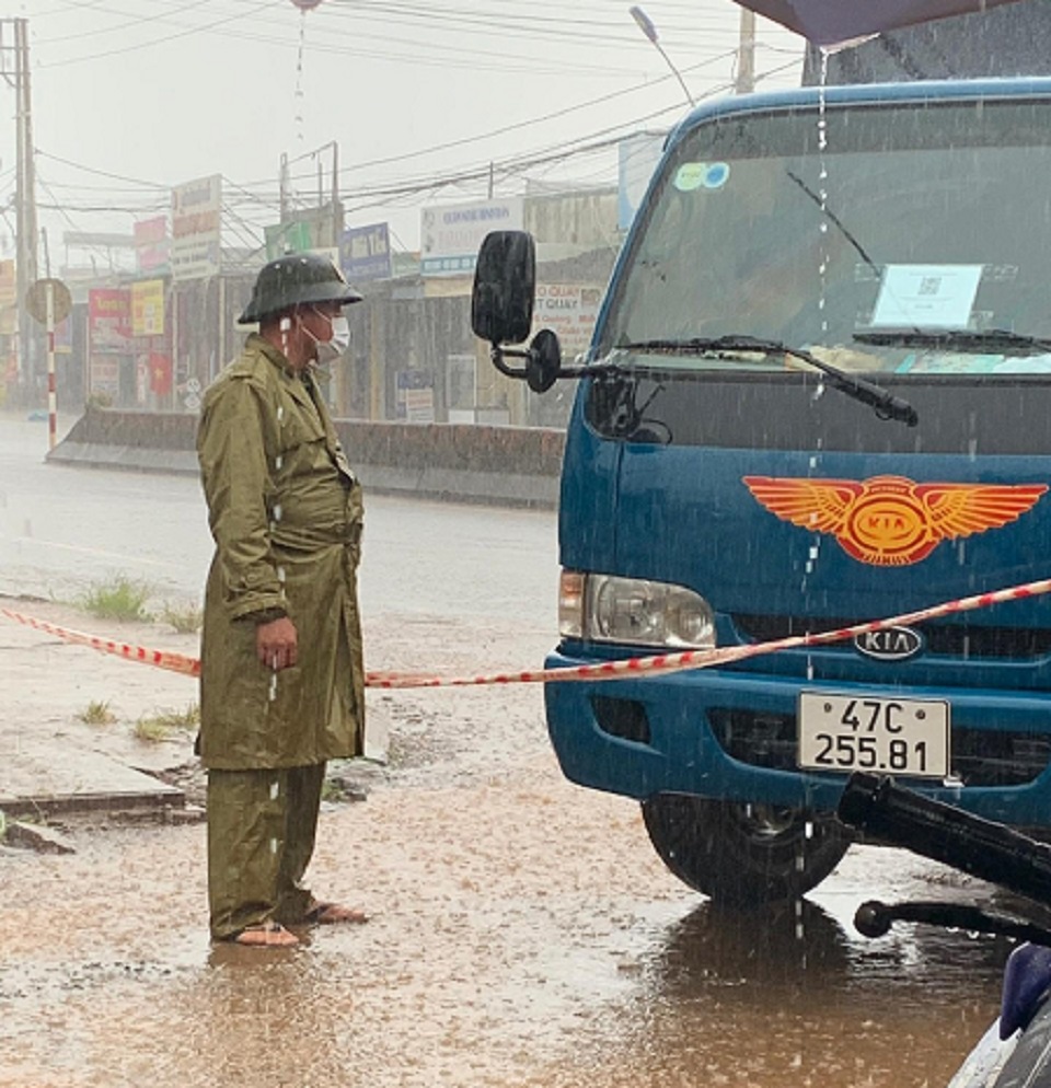 Mặc dù trời mưa rất to nhưng cán bộ trực chốt vẫn căng mình làm nhiệm vụ.