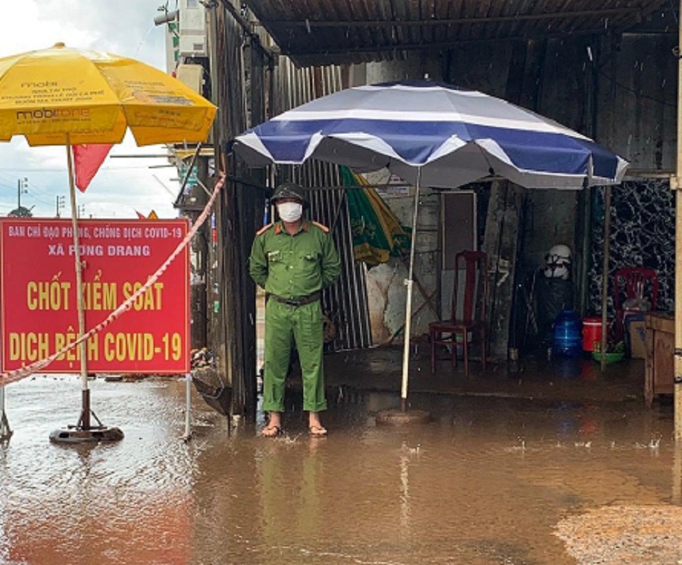 Chốt kiểm soát dịch COVID-19 ở xã Pơng Drang, huyện Krông Búk vẫn luôn đảm bảo công tác phòng chống dịch bất chấp mưa bão.