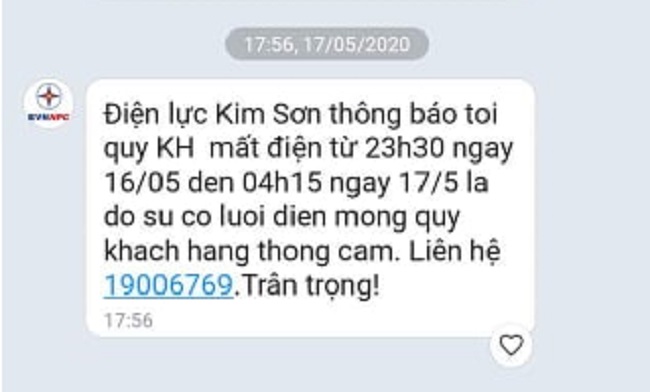 Theo đó, khách hàng thực hiện nhiều cuộc gọi vào lúc 00h14 phút ngày 17/5/2020 đến số 1900 6769, mặc dù có chuông điện thoại nhưng không có ai tiếp nhận khiến người dân bức xúc. Đáng nói, sau 20 giờ đồng hồ mất điện, người dân mới nhận được tin nhắn thông báo của EVN Kim Sơn.