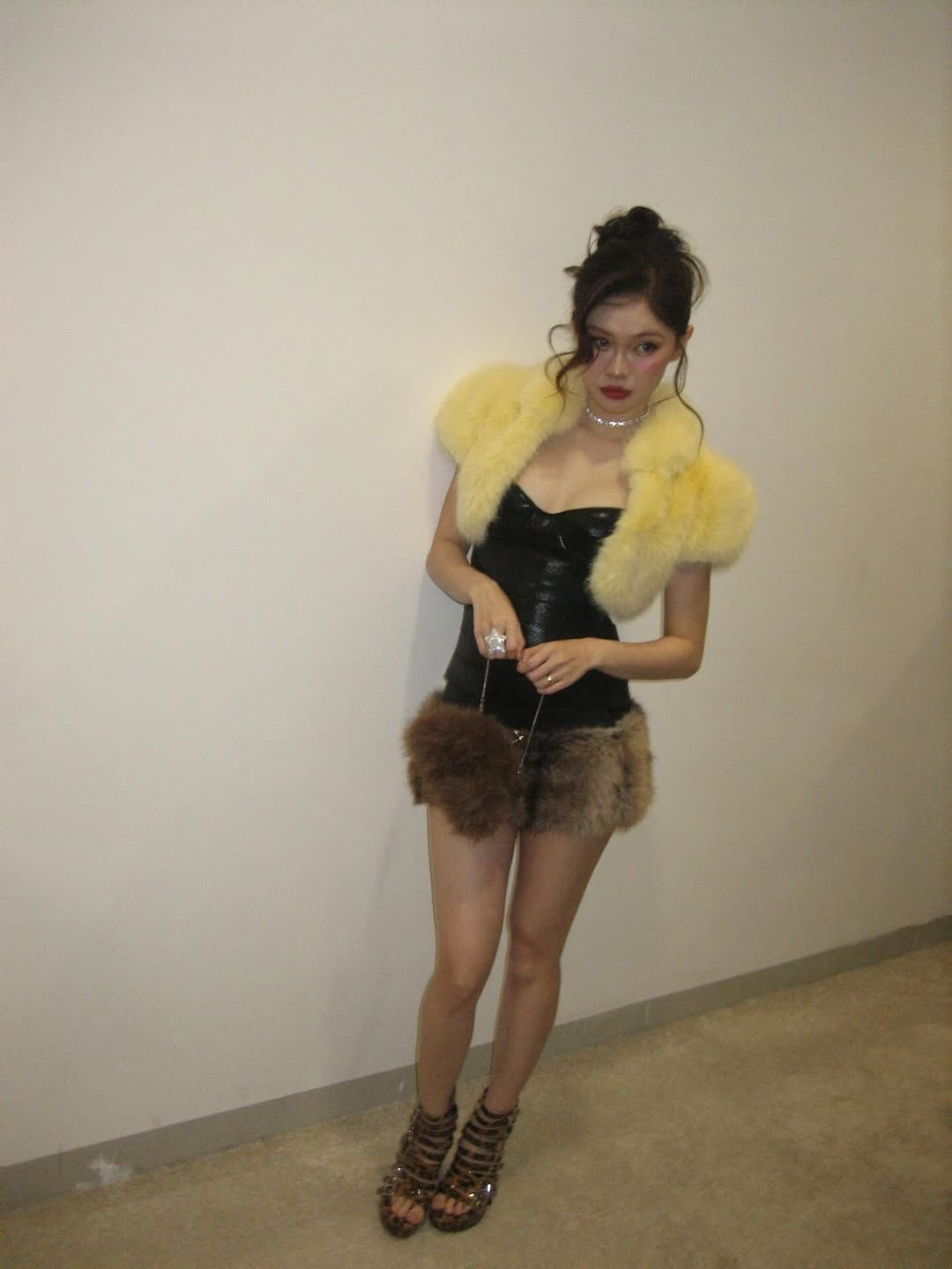 Ly Phạm mang đến màn phối kín đáo hơn đàn chị khi tinh tế chọn thiết kế áo hai dây ôm sát bên trong và chân váy chất liệu lông đồng điệu. Ngọc Trinh chọn cách phối đồ với boots cao cổ da đen và tất đùi, tạo nên vẻ ngoài mạnh mẽ và cá tính. Trong khi đó, Ly Phạm lại chọn sandals cao gót để hoàn thiện tổng thể.