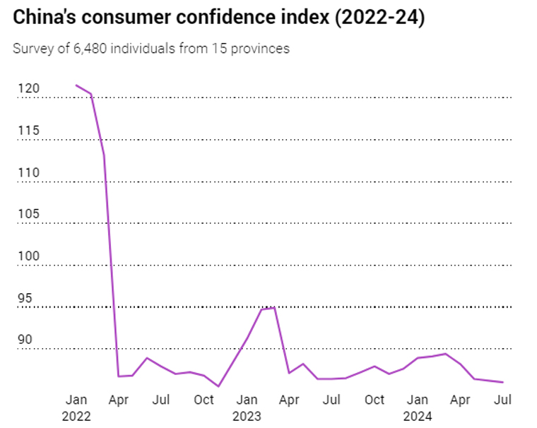 Chỉ số niềm tin người tiêu dùng Trung Quốc (2022-24) cho thấy liên tục suy giảm trong những năm qua: Nguồn: National Bureau of Statistics