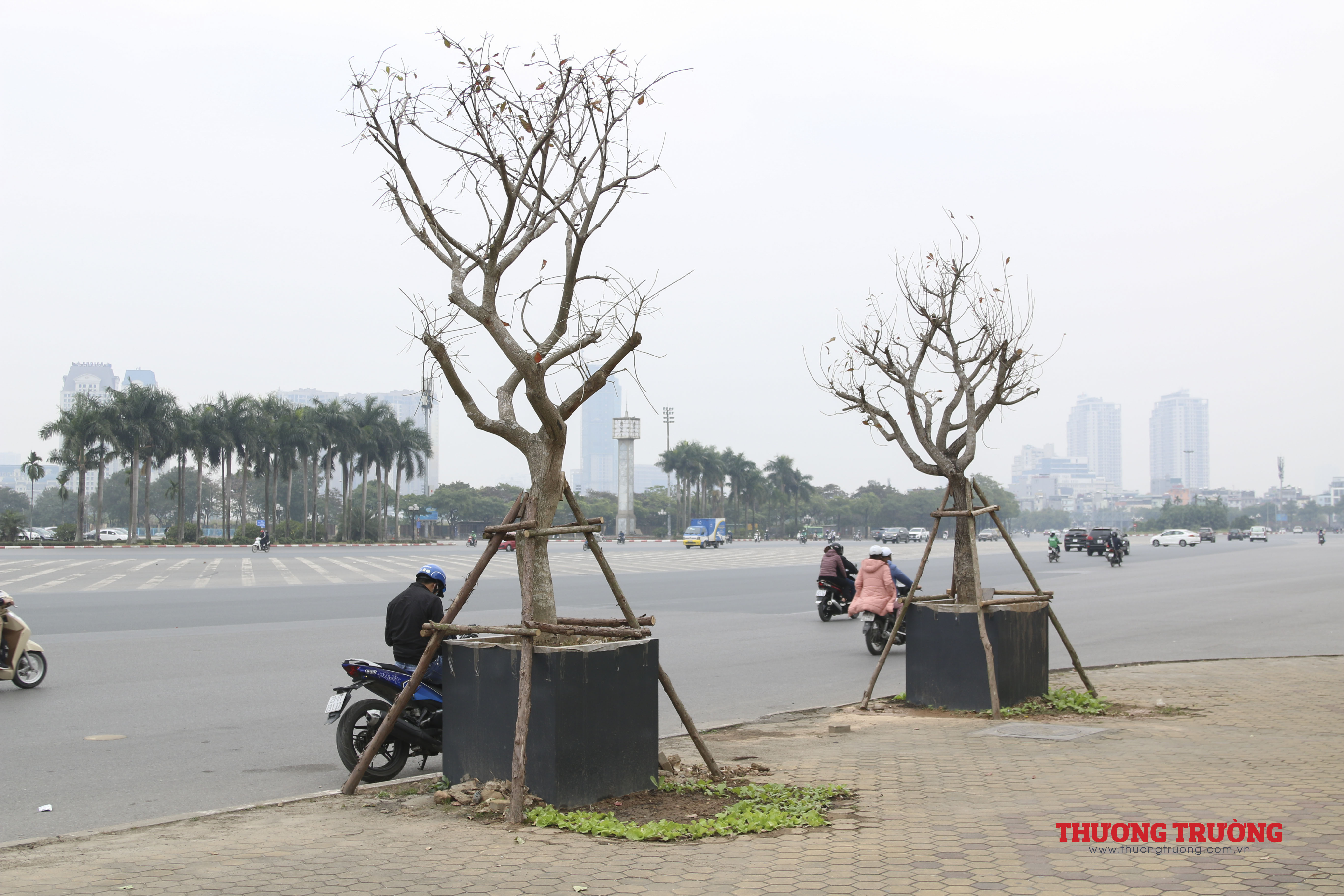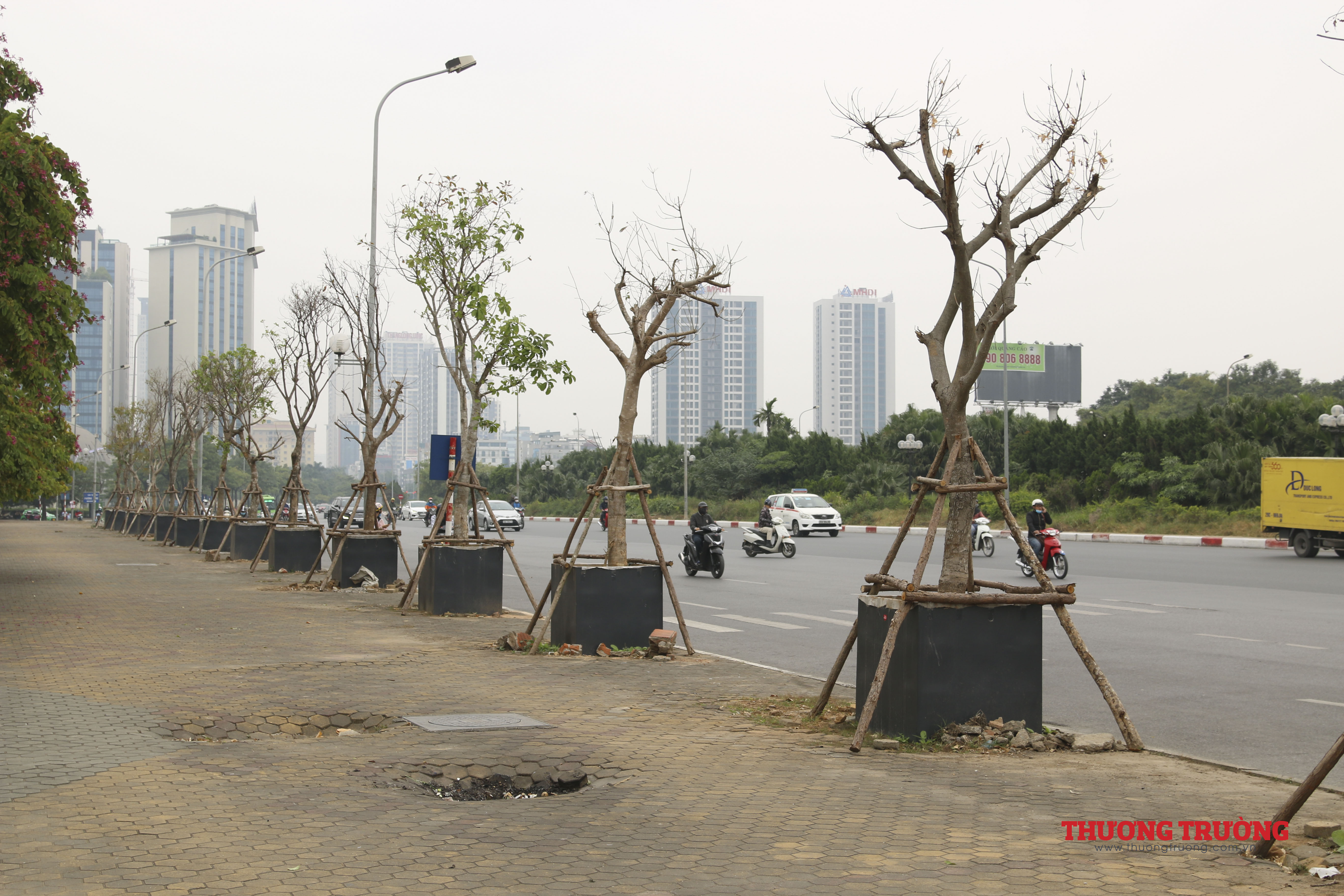 Hàng chục cây xanh (cây lộc vừng) được quây bồn, trồng trên vỉa hè đường Lê Đức Thọ, gần với sân vận động quốc gia Mỹ Đình (Nam Từ Liêm, Hà Nội).