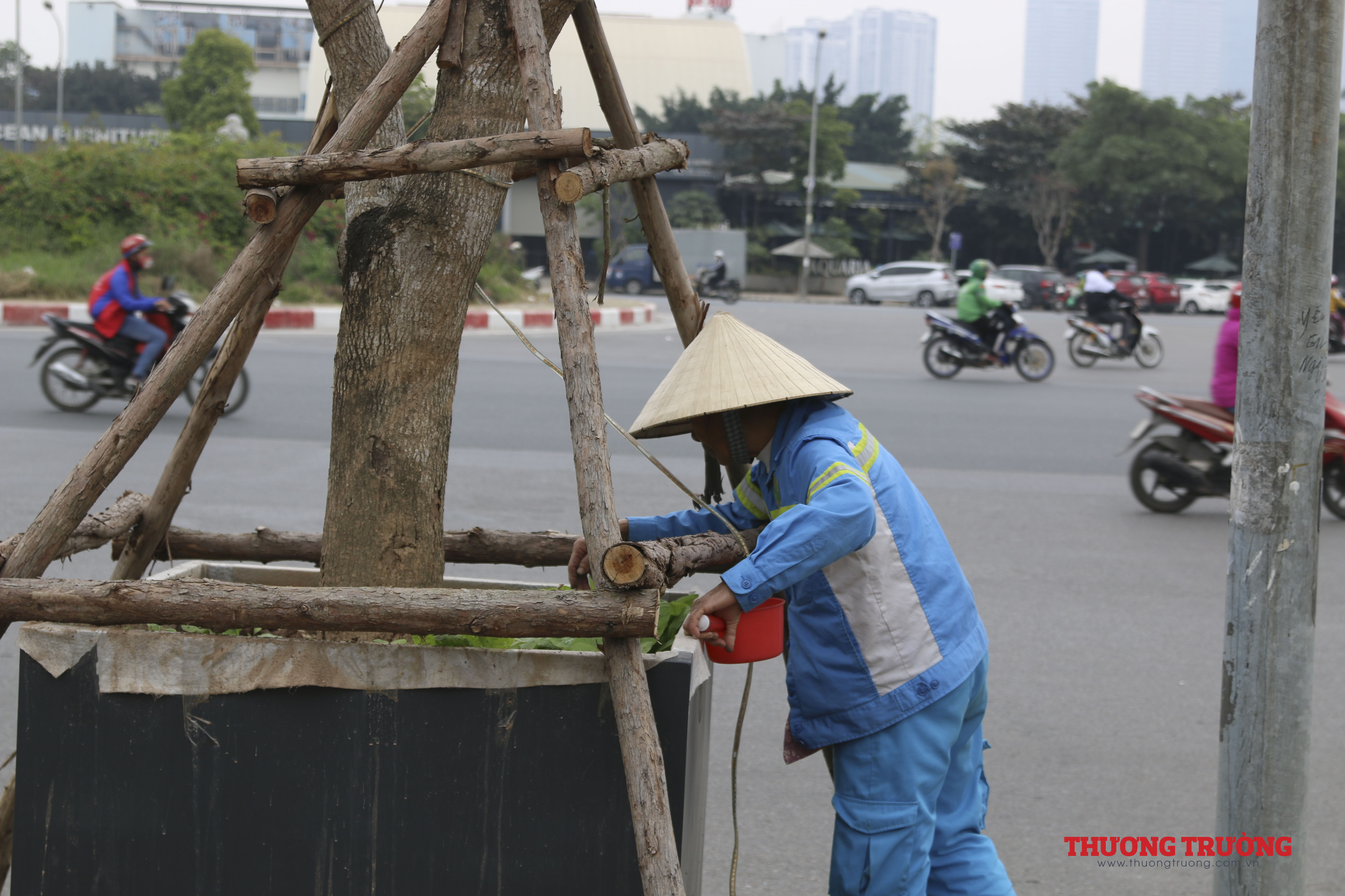 Vỉa hè đường Lê Đức Thọ rộng thênh thang nhưng những cây lộc vừng này lại không được trồng thẳng xuống đất mà trồng vào trong những bồn nhựa khung thép chật chội.