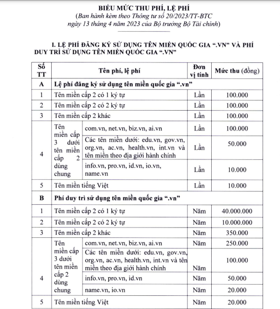 Theo biểu mức thu phí, lệ phí ban hành kèm theo Thông tư số 20/2023/TT-BTC, mức thu lệ phí đăng ký sử dụng tên miền quốc gia (.vn) như sau: tên miền cấp 2 có 1 ký tự: 100.000 đồng/lần; tên miền cấp 2 có 2 ký tự: 100.000 đồng/lần; tên miền cấp 2 khác: 100.000 đồng/lần.