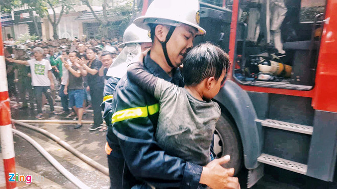 | Cảnh sát đưa cháu bé ra khỏi hiện trường vụ cháy (Ảnh Zing.vn) |