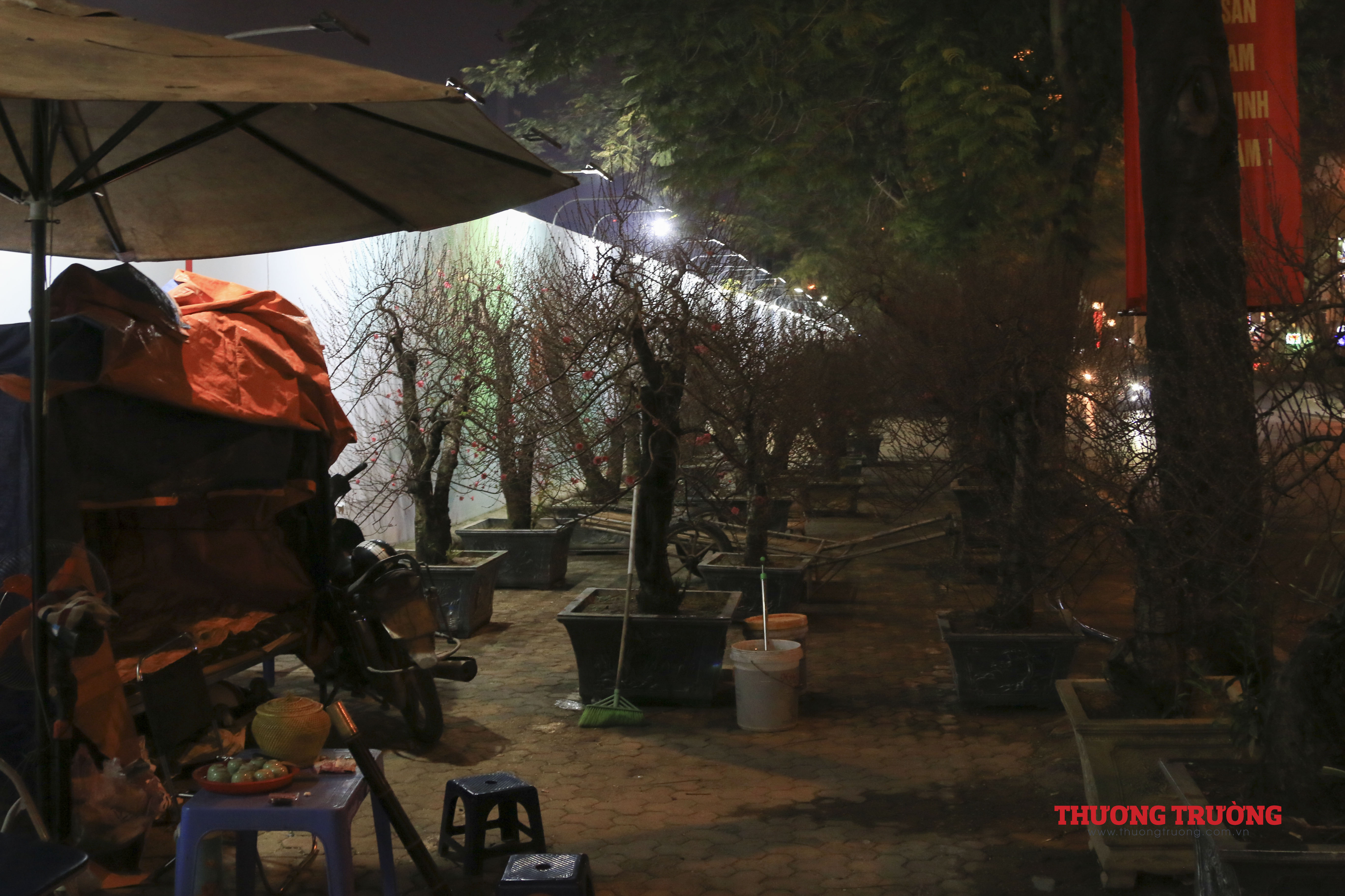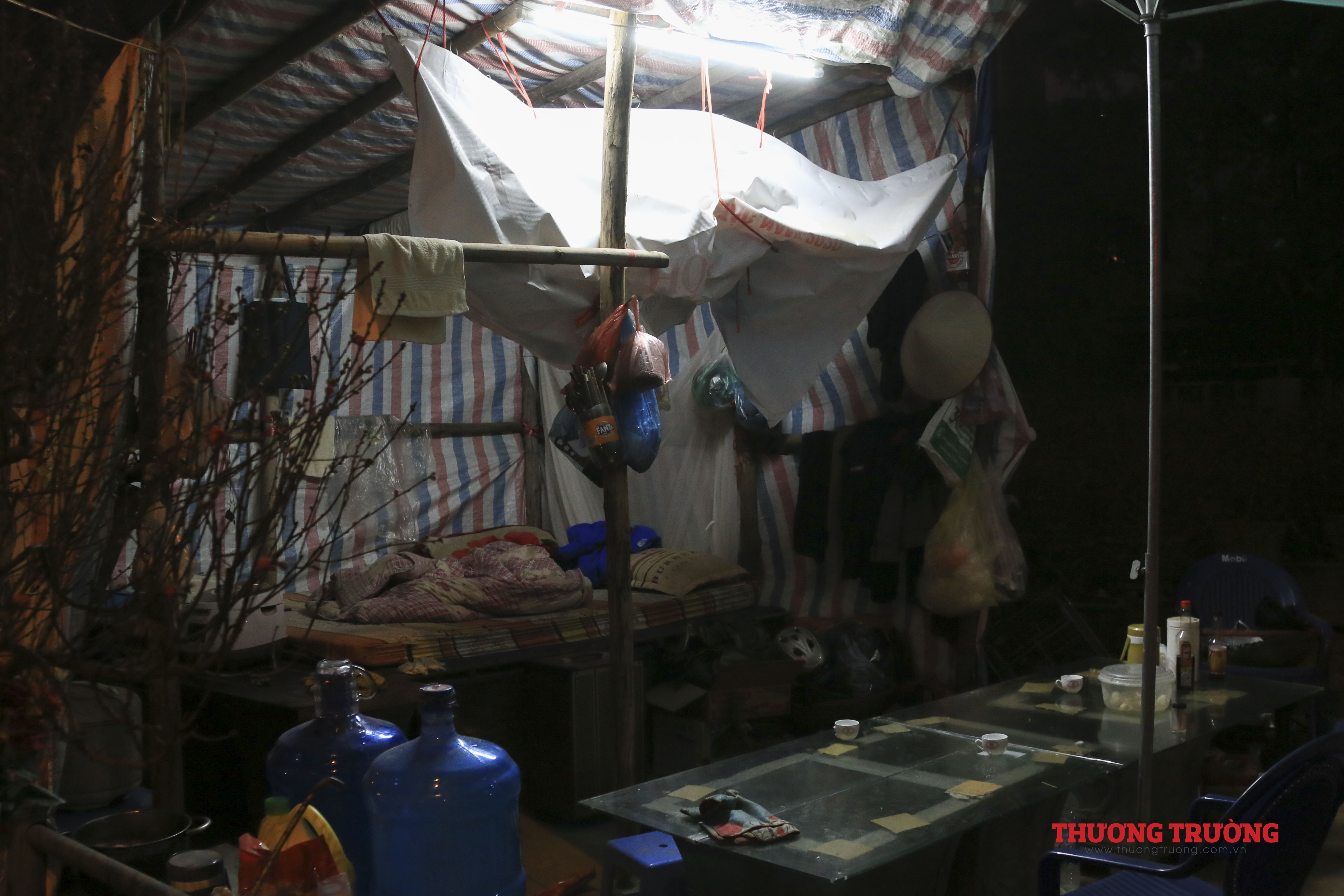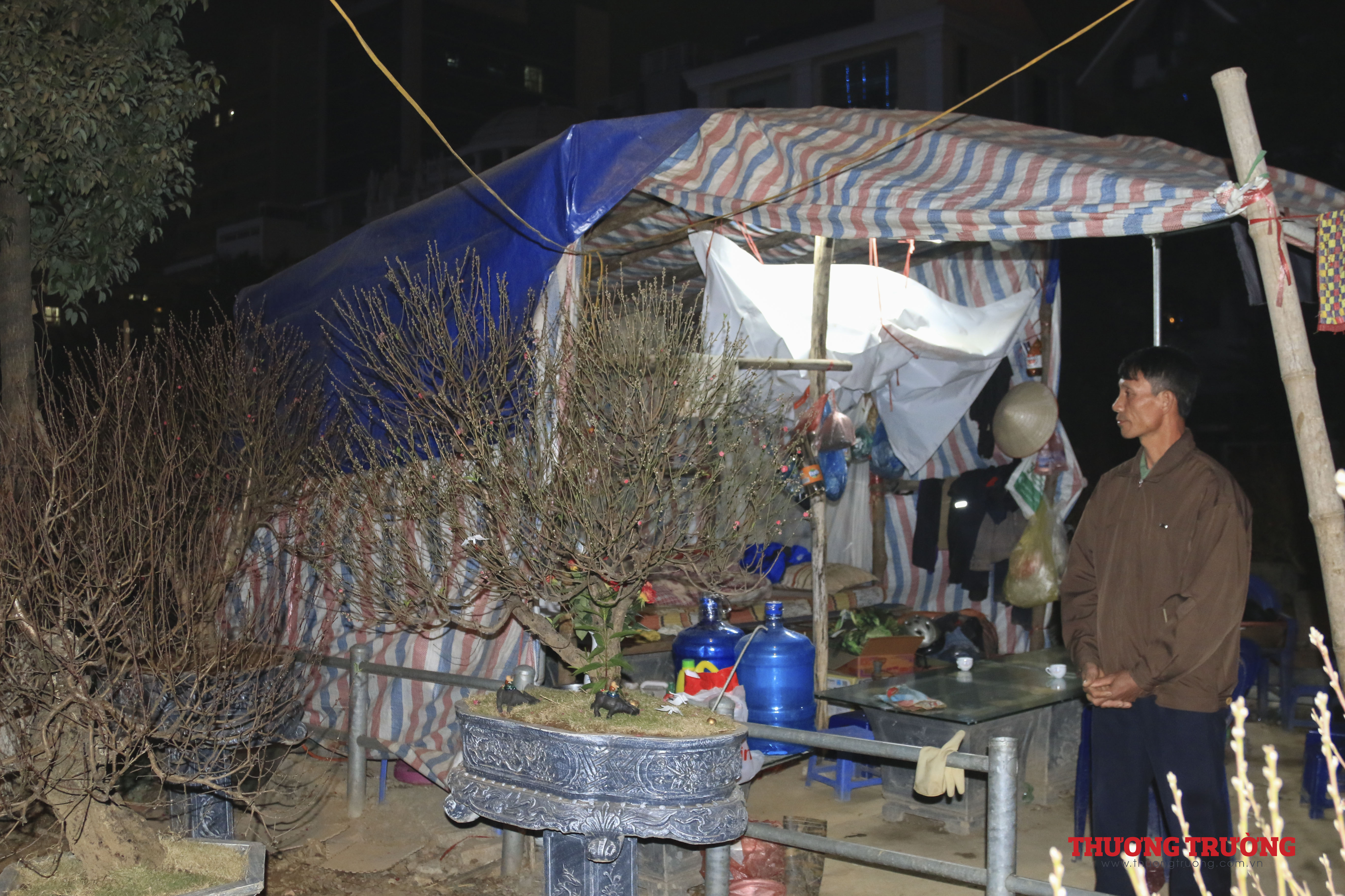 Nhiều chủ đào đã ngủ ở chợ gần tháng nay, tiếp tục bám trụ bán đến hết buổi sáng 30 Tết mới dọn hàng nghỉ.