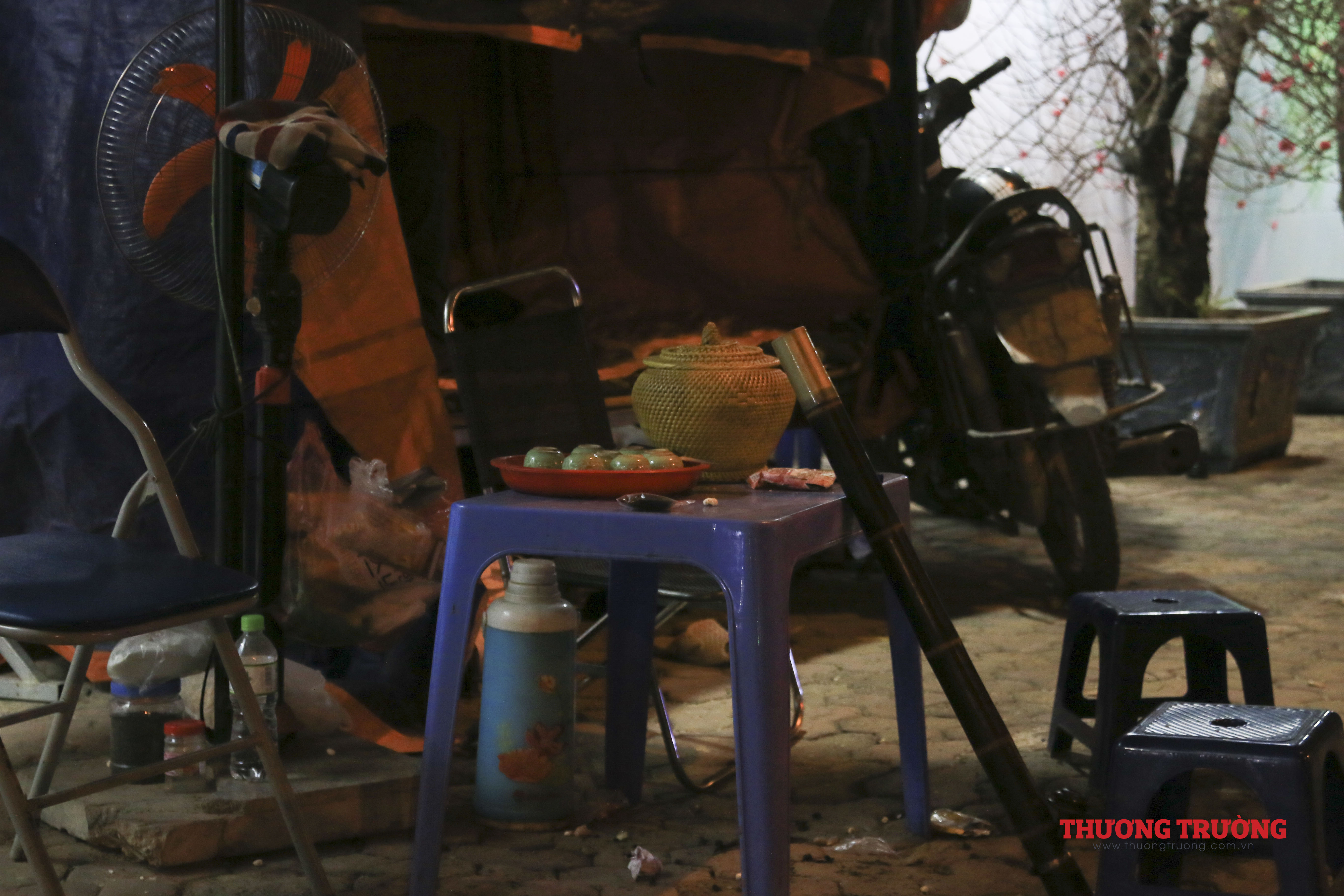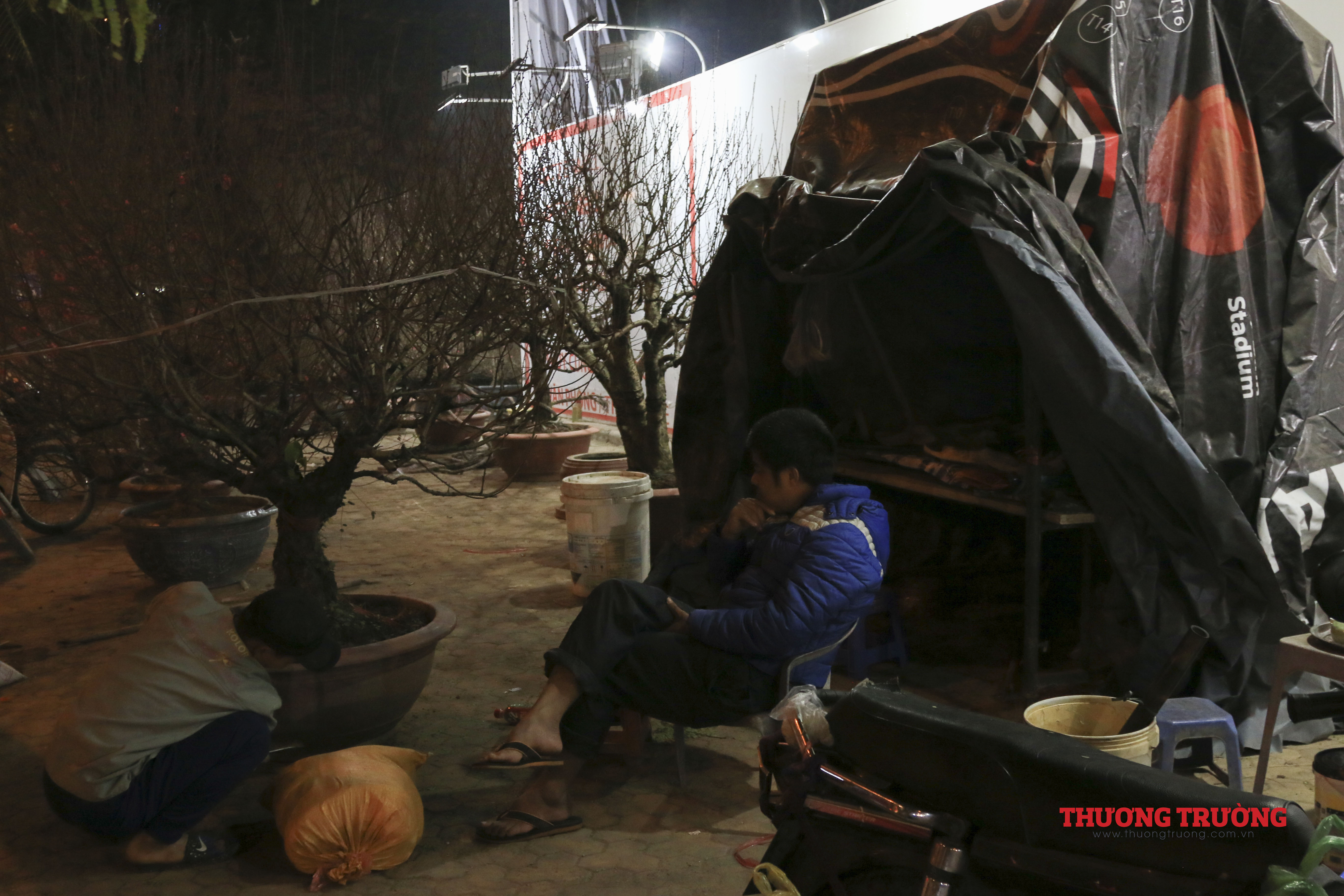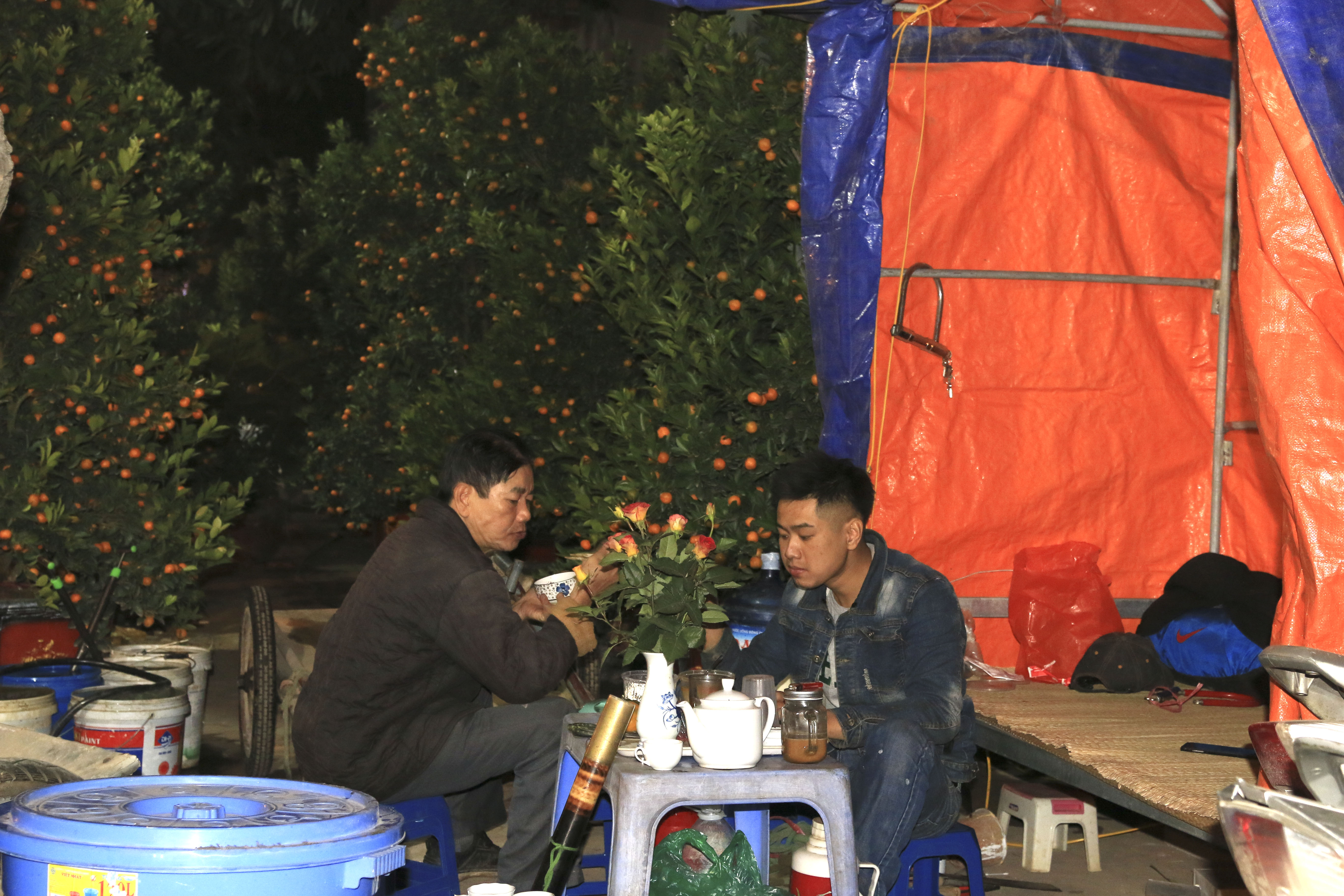 Đêm khuya muộn, anh Phạm Tất Cương (Thái Bình) cùng bố ăn cơm trông cây. Anh cho biết:" Gia đình tôi mấy năm nay cũng mang quất, đào dưới quê lên đây để bán phục vụ người dân Thủ đô nhưng do dịch Covid19 năm nay buôn bán có phần chậm hơn, 30 chưa phải là Tết nên cứ đến đâu hay đến đó", anh cười lạc quan.