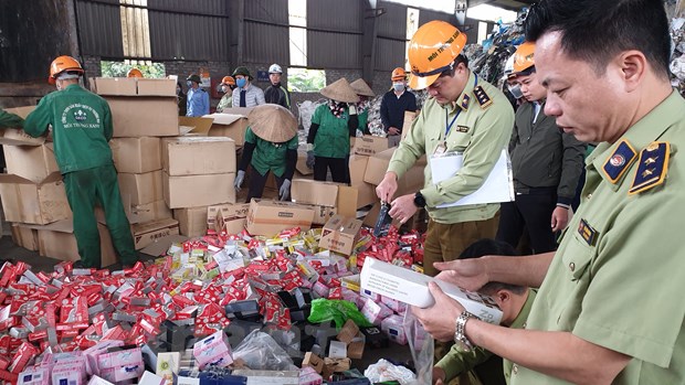 Lực lượng Quản lý thị trường Hà Nội tiêu hủy hàng hóa vi phạm. (Ảnh: Đức Duy/Vietnam+)