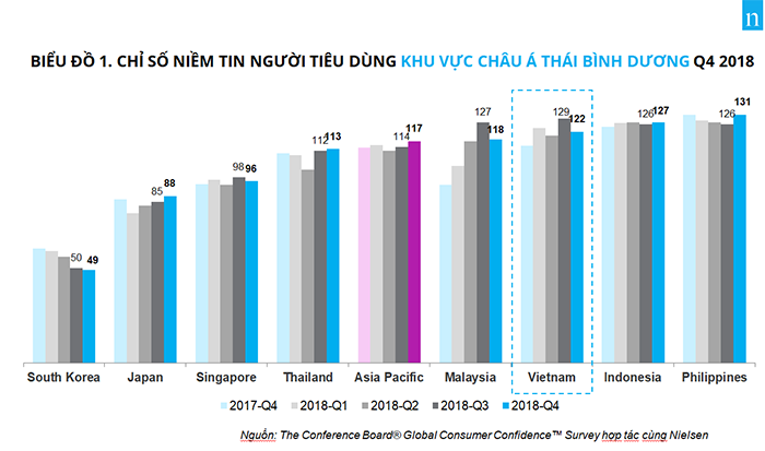 So với quý 3 năm 2018, chỉ số niềm tin người tiêu dùng Việt Nam giảm 7 điểm. Sự giảm điểm này là điều nằm trong dự kiến, theo nhận định của bà Nguyễn Hương Quỳnh, Tổng Giám Đốc Nielsen Việt Nam - ”Trước thềm năm mới 2019 người tiêu dùng Việt Nam tỏ ra lo lắng về tiền thưởng cuối năm cũng như các khoản chi tiêu ngày Tết là do một phần đến từ những gì xảy ra trong Tết 2018 không thực sự như kỳ vọng, dẫn đến việc giảm điểm CCI như đã thấy.” Tuy nhiên, với xu hướng tăng đều trong cả năm, điểm CCI của Việt Nam cuối năm 2018 vẫn cao hơn nhiều so với mức trung bình của khu vực và thế giới (lần lượt là 117 và 107 điểm).