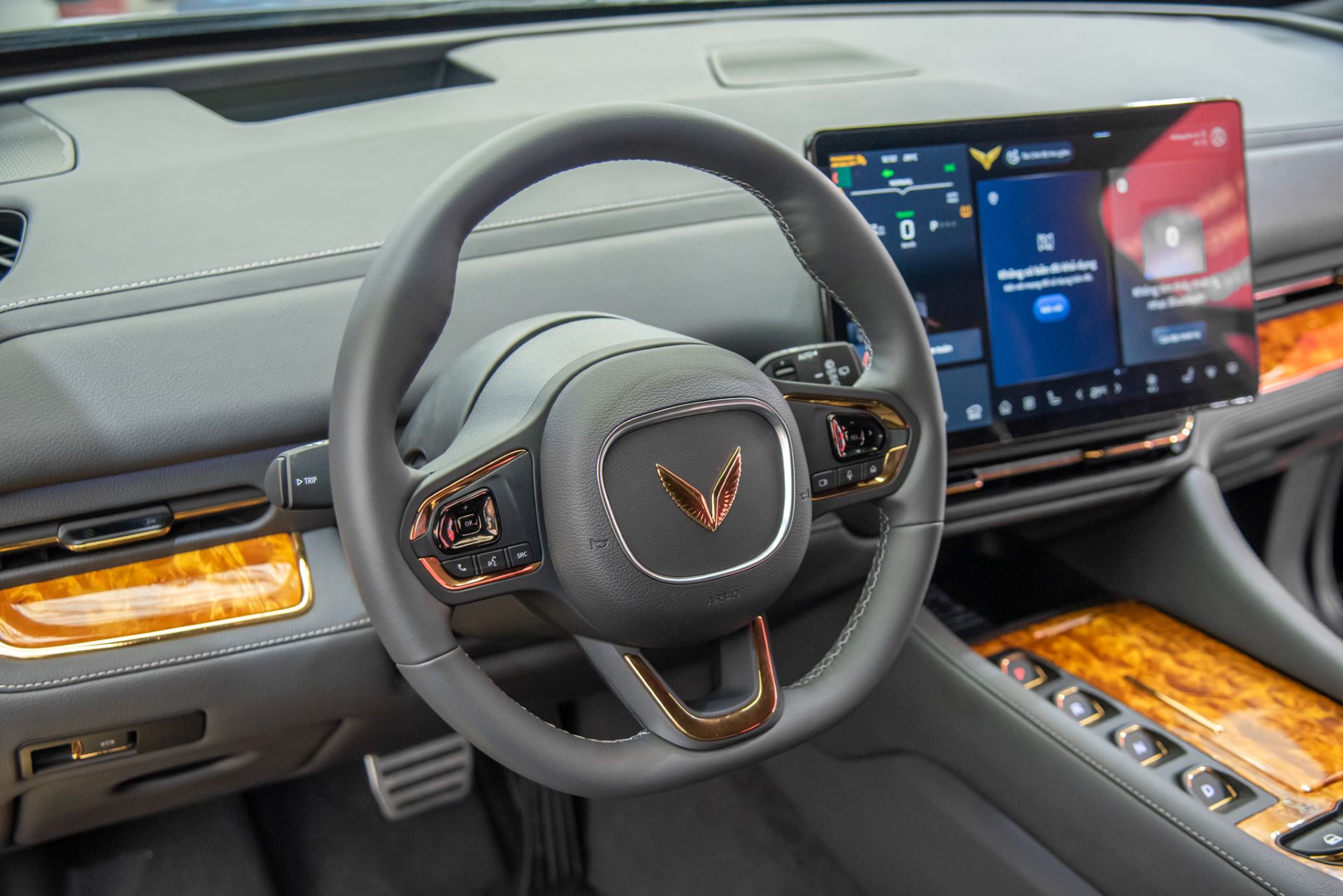Ngoại thất đã vô cùng ấn tượng, nhưng nội thất còn khiến nhiều người bất ngờ không kém. Khoang lái vẫn tuân thủ phong cách thiết kế tối giản của VinFast, nhưng từng chi tiết được nâng cấp tinh xảo bằng những vật liệu quý hiếm. Cụ thể, logo Lạc Hồng hiện diện ngay trên vô-lăng, viền các phím bấm, bệ trung tâm và cánh cửa đều được mạ vàng.
