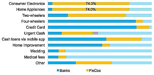 Theo khảo sát mới đây của Fiin Group, đồ điện tử, thiết bị gia đình và xe hai bánh là 3 mặt hàng phổ biến nhất được người tiêu dùng Việt Nam chọn mua trả góp thông qua các công ty tài chính. Cụ thể, 74% khách hàng khi mua đồ điện tử tiêu dùng và thiết bị gia đình sẽ nghĩ đến vay qua công ty tài chính trước tiên, nếu họ không muốn chi trả ngay toàn bộ.