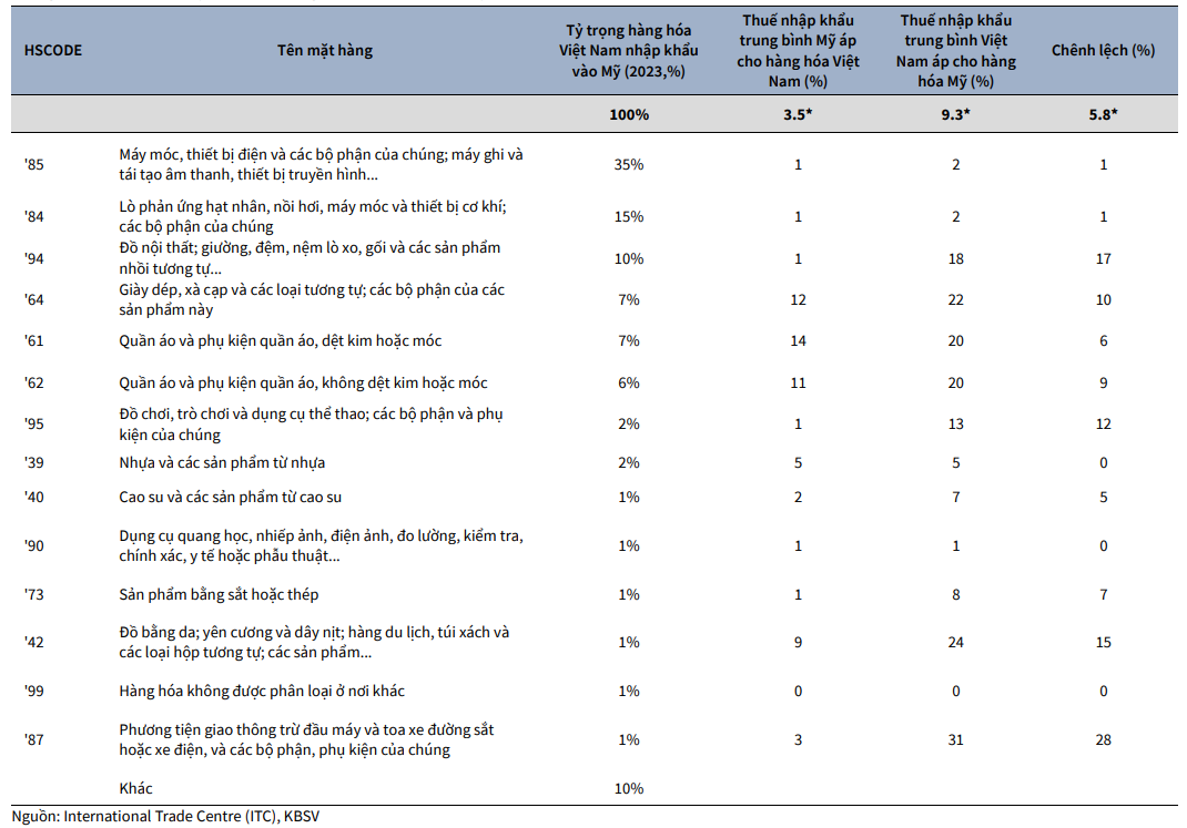 Cụ thể, Việt Nam đang đánh thuế nhập khẩu trung bình cao hơn 5.8% mức thuế nhập khẩu mà Mỹ đang áp dụng và nếu tính thêm VAT thì con số này lên đến gần 11%. Theo tính toán của KBSV Research dựa trên phương pháp bình quân gia quyền với trọng số theo tỷ trọng trong rổ hàng hóa Việt Nam nhập khẩu vào Mỹ, thuế nhập khẩu trung bình của Việt Nam là 9.3%. Trong khi, thuế nhập khẩu trung bình của Mỹ là 3.5%.