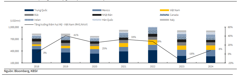 Trong Báo cáo chuyên đề 'Việt Nam trước tác động của Tradewar 2.0', khối phân tích Chứng khoán KB Việt Nam (KBSV Research) cho rằng Việt Nam đang đối mặt với nguy cơ bị đưa vào danh sách các nước bị áp Thuế đối ứng của Mỹ do đứng Top 3 thâm hụt thương mại lớn với Mỹ và đang áp mức thuế nhập khẩu bình quân từ Mỹ cao hơn so với chiều ngược lại.