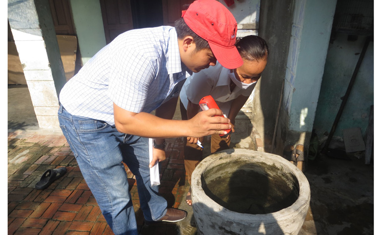 Cán bộ Trung tâm Kiểm soát bệnh tật tỉnh Phú Yên kiểm tra bọ gậy tại hộ gia đình ở phường 9 (TP Tuy Hòa).