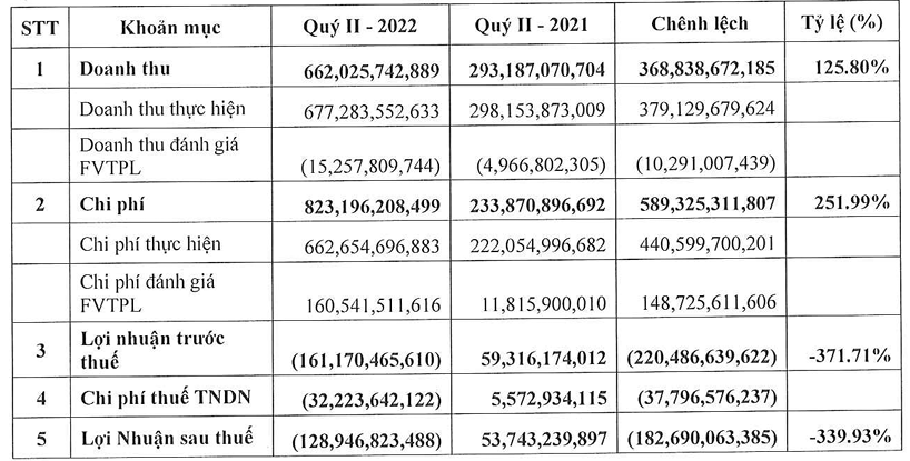 Trong khi đó, chi phí hoạt động tăng đột biến 329%, lên 698 tỷ đồng. Nguyên nhân đến từ việc Công ty cắt lỗ loạt cổ phiếu và trái phiếu trong danh mục, dẫn đến việc hạch toán lỗ các tài sản tài chính FVTPL tăng 488%, lên gần 528 tỷ đồng.