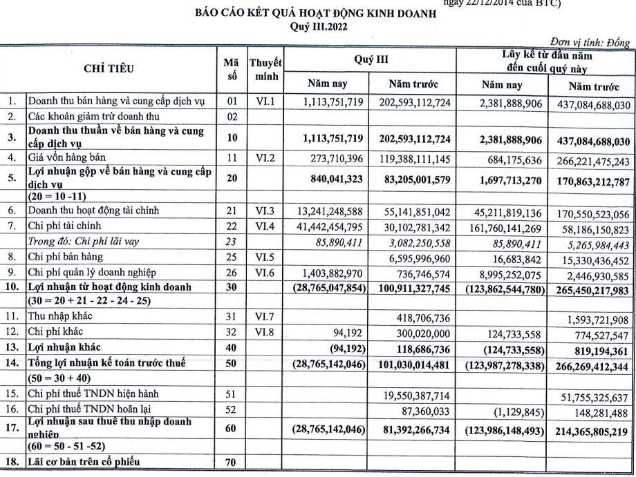 Lũy kế 9 tháng đầu năm, công ty ghi nhận doanh thu đạt 2,38 tỷ đồng, giảm 99,5% so với cùng kỳ và lợi nhuận sau thuế ghi nhận lỗ 124 tỷ đồng trong khi cùng kỳ lãi lên đến 214 tỷ đồng, tức giảm tới hơn 338 tỷ đồng.