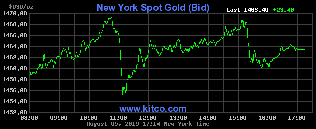 Hiện tại giá vàng đang ở mức cao hơn 15% so với mức thấp thiết lập trong năm 2019. Giá vàng đã tăng chóng mặt trong những phiên gần đây sau khi Tổng thống Mỹ Donald Trump đẩy cao cuộc chiến thương mại với Trung Quốc bằng cách thông báo đánh thuế bổ sung với hàng hóa Trung Quốc và Trung Quốc thông báo sẽ trả đũa.