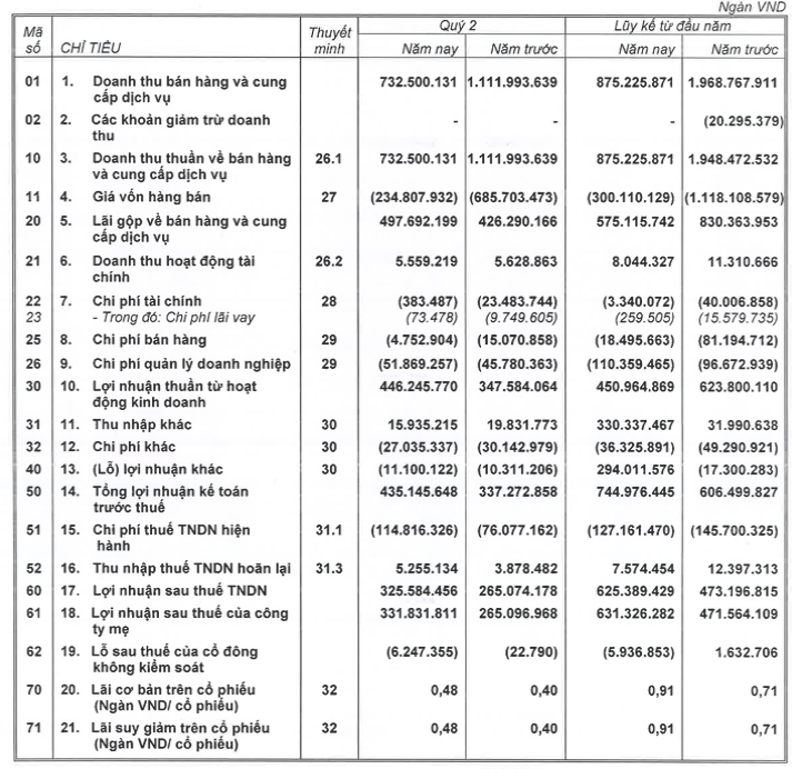 Lũy kế trong 6 tháng đầu năm, Nhà Khang Điền ghi nhận doanh thu đạt 875,2 tỷ đồng, giảm 55,1% so với cùng kỳ và lợi nhuận sau thuế đạt 625,4 tỷ đồng, tăng 32,2% so với cùng kỳ.