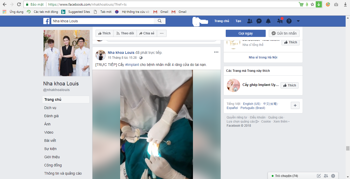 Theo đó trên trang fanpage của Nha khoa Louis đã phát trực tiếp nhiều ca thực hiện dịch vụ răng miệng cho bệnh nhân trong giờ hành chính các ngày từ thứ 2 đến thứ 6. Cụ thể ca cấy implant được Nha khoa Louis thực hiện vào lúc 15h28p thứ 4, ngày 15/8/2018.