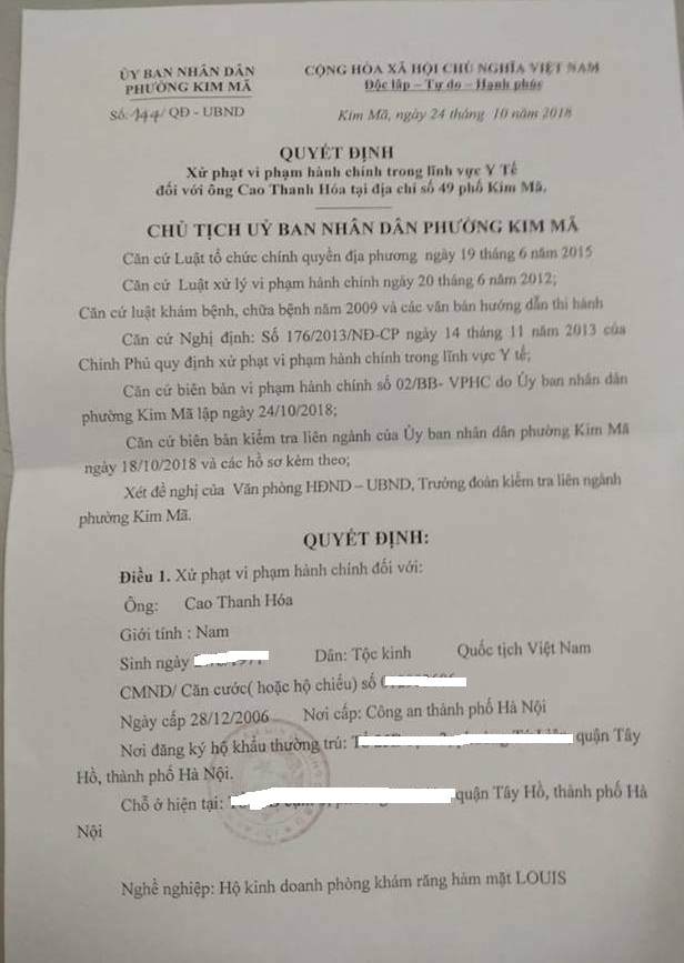 | Nha khoa Louis bị UBND phương Kim Mã xử phạt do hoạt động cả trong giờ hành chính không được cấp phép. |