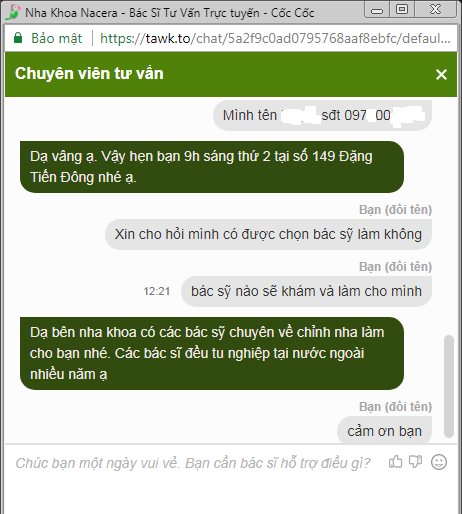 Để có thông tin khách quan, trong vai bệnh nhân đang có bệnh lý về răng miệng, PV đã trao đổi với nhân viên của Nha khoa Nacera qua trang web nhakhoanacera.com.