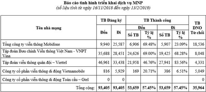 Theo số liệu khảo sát, MobiFone có 25.587 người dùng đăng ký chuyển mạng, trong đó chuyển đi thành công 6.906 trường hợp (đạt tỷ lệ 23,09%); VinaPhone có 28.451 người dùng đăng ký chuyển mạng, chuyển đi thành công 19.425 trường hợp (đạt tỷ lệ 68,28%); Viettel có 33.438 người dùng đăng ký chuyển mạng, chuyển đi thành công 27.941 trường hợp (đạt tỷ lệ 83.56%).