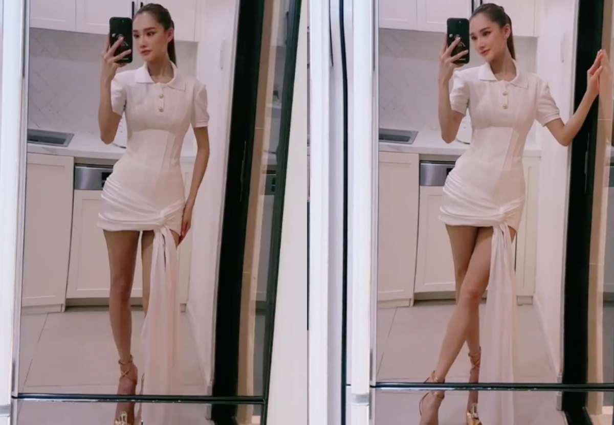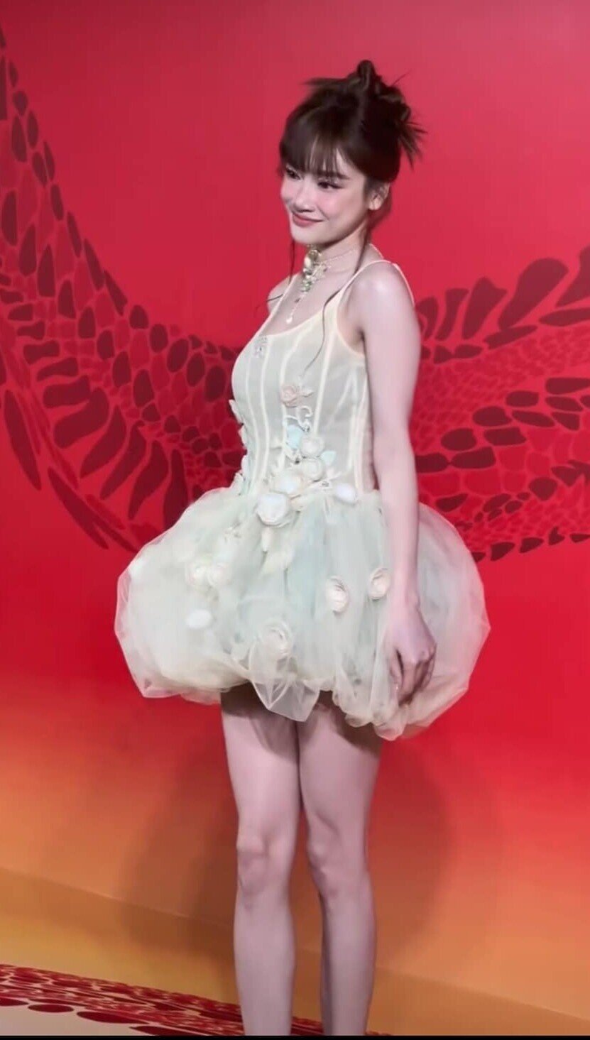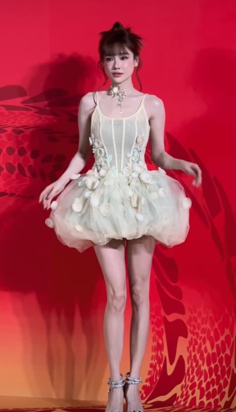 Trước đó tại một sự kiện, Nhã Phương diện chiếc đầm hai dây với phần chân váy bí bồng xòe để lộ đôi chân gầy kém sắc.