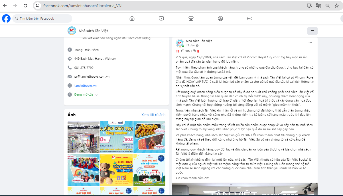 Nhà sách Tân Việt đã đăng tải bài viết thừa nhận những hình ảnh trên là sản phẩm của Nhà sách và xin lỗi trên nền tảng Facebook