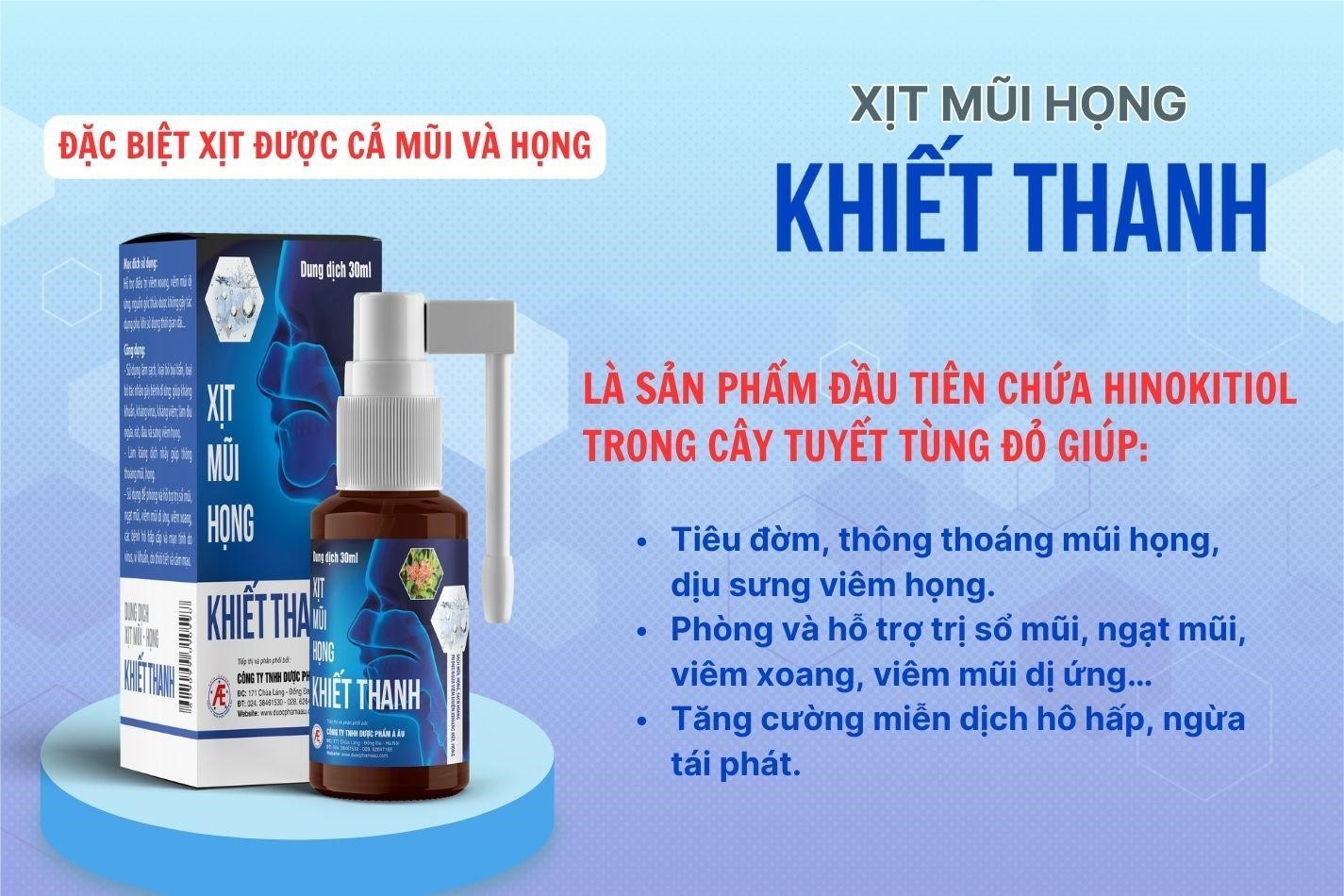 Tại Việt Nam, Xịt mũi họng Khiết Thanh là sản phẩm đầu tiên trên thị trường chứa hoạt chất Hinokitiol từ cây tuyết tùng đỏ Bắc Mỹ. Nhiều nghiên cứu đã chứng minh Hinokitiol có tác dụng kháng khuẩn trên nhiều chủng vi khuẩn gây viêm đường hô hấp, đồng thời như một cỗ xe vận chuyển kẽm vào tế bào giúp tăng cường hệ miễn dịch. Sử dụng hàng ngày Xịt mũi họng Khiết Thanh giúp làm sạch vùng hầu họng, tiêu diệt vi khuẩn, virus, vừa tăng cường hệ miễn dịch, đẩy lùi viêm xoang từ tận gốc rễ. Đồng thời hỗ trợ giảm các triệu chứng sổ mũi, ngạt mũi, sưng tấy, đau rát mũi họng do bệnh viêm xoang và một số bệnh lý viêm đường hô hấp khác.