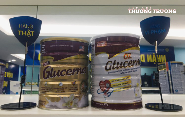 Dòng sản phẩm sữa dinh dưỡng Glucerna thật và giả. Hàng thật (trái) được nhập khẩu chính ngạch và hàng giả (phải) được sản xuất trong nước. Nếu bằng mắt thường, chúng ta có thể nhận thấy một số điểm bất hợp lý so với hàng được bảo hộ là thân hộp sữa giả nhãn hiệu Glucerna cao hơn sản phẩm được bảo hộ, nắp hộp màu trắng, chữ đổ bóng vàng...