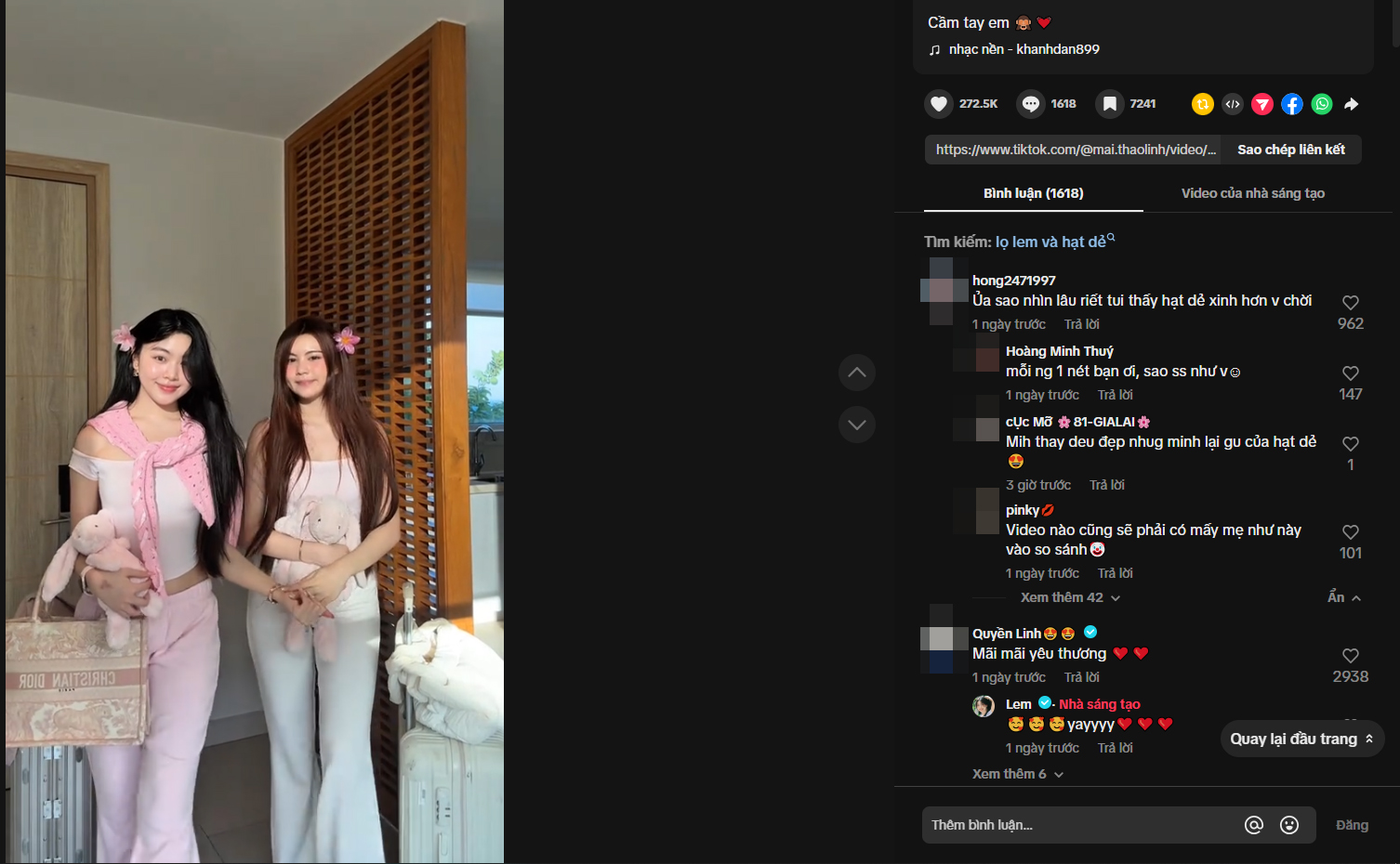 Hiện video nhận về hơn 3 triệu lượt xem cùng hàng trăm nghìn lượt cảm xúc, chia sẻ và bình luận. Ngoài những ý kiến ngợi khen nhan sắc đẹp đồng đều của 2 chị em, cũng xuất hiện không ít bình luận so sánh nhan sắc.