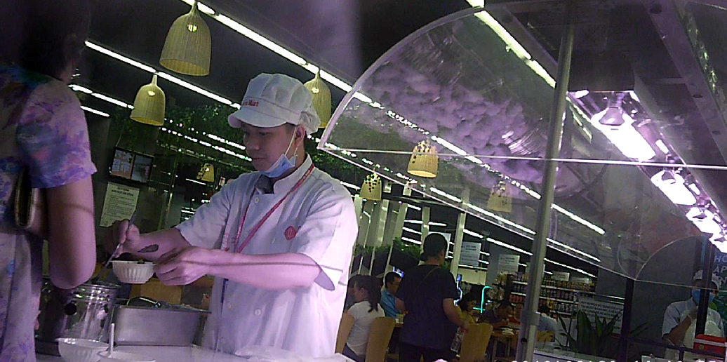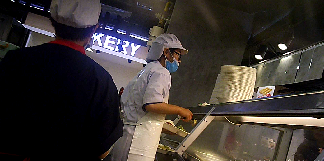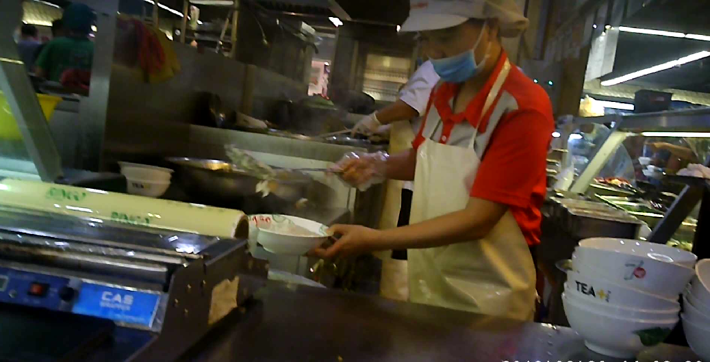 Trong khi một số nhân viên chỉ đeo một găng tay, số khác thậm chí còn không đeo găng tay, đeo khẩu trang khi trực tiếp cầm bát và gắp đồ ăn đã được chế biến chín bán cho khách hàng.