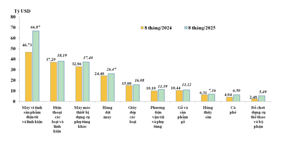 10 nhóm hàng xuất khẩu lớn nhất của Việt Nam trong 8 tháng/2024 và 8 tháng/2025