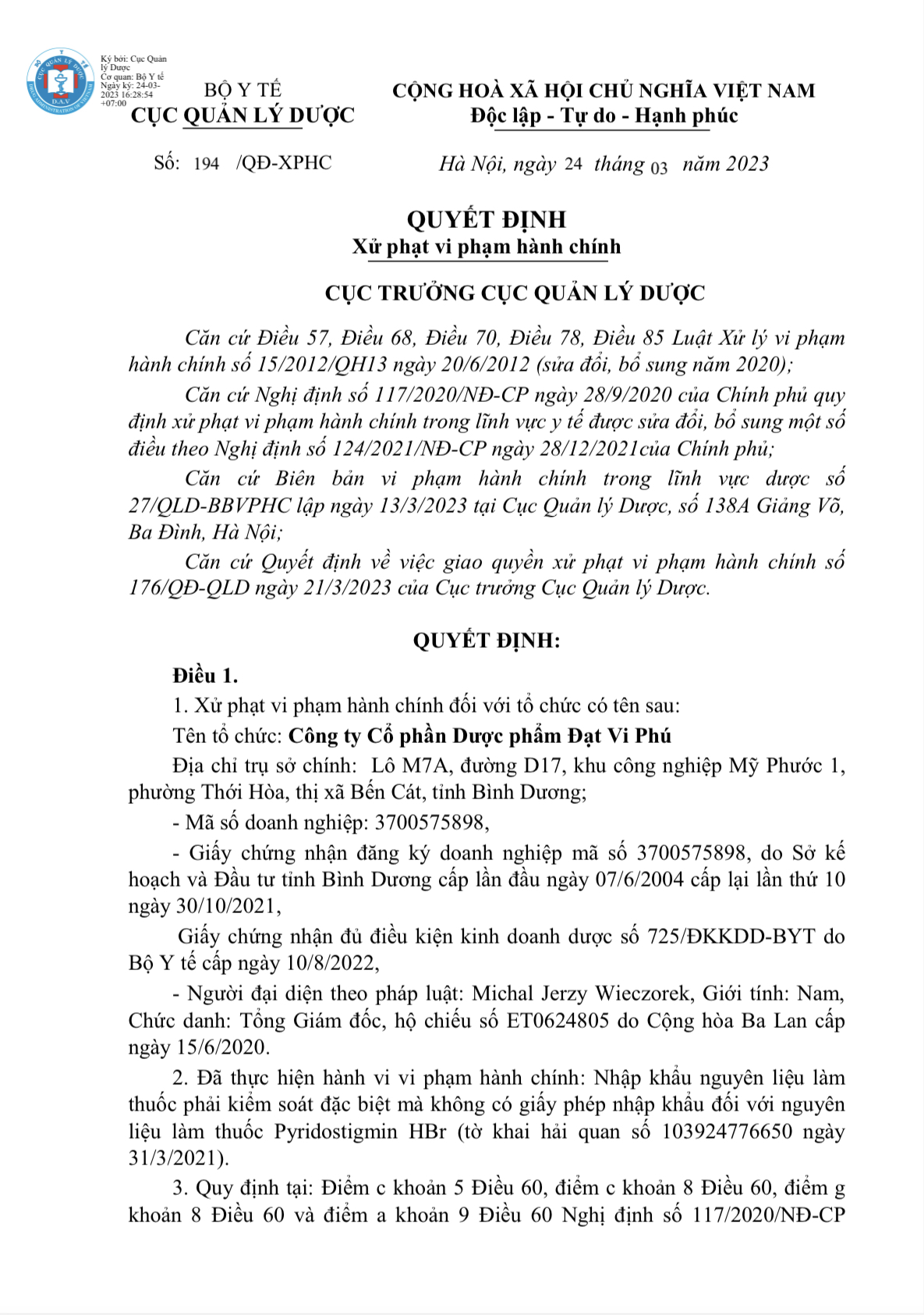 Cụ thể, tại quyết định số 194/QĐ-XPH của Cục Quản lý Dược, Công ty Cổ phần Dược phẩm Đạt Vi Phú ( địa chỉ trụ sở chính: Lô M7A, đường D17, khu công nghiệp Mỹ Phước 1, phường Thới Hòa, thị xã Bến Cát, tỉnh Bình Dương) đã thực hiện hành vi vi phạm hành chính: Nhập khẩu nguyên liệu làm thuốc phải kiểm soát đặc biệt mà không có giấy phép nhập khẩu đối với nguyên liệu làm Pyridostigmin HBr (tờ khai hải quan số 103924776650 ngày 31/3/2021).