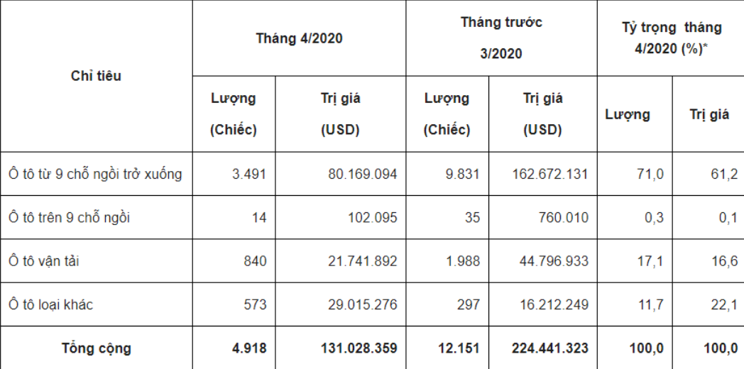 Cụ thể, trong tháng 4/2020 số lượng ô tô nguyên chiếc các loại đăng kí làm thủ tục hải quan nhập khẩu giảm gần 60% (tương ứng giảm 7.233 chiếc) so với tháng 3. Số lượng nhập khẩu trong tháng 4 đạt 4.918 chiếc, tương ứng trị giá nhập khẩu 131 triệu USD.