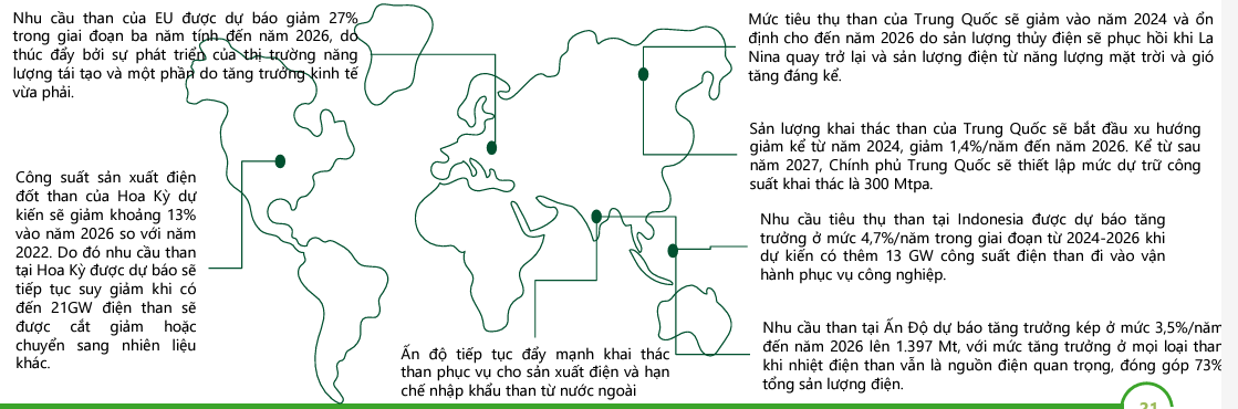 Nhu cầu than trên toàn thế giới được dự báo giảm từ năm 2024, với một phần từ tốc độ phát triển của năng lượng tái tạo (NLTT), xen lẫn các yếu tố ảnh hưởng trọng yếu như kinh tế Trung Quốc phục hồi, hay đà giảm tại Mỹ và EU.