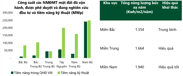 Việt Nam có tiềm năng lớn phát triển điện mặt trời lên tới 914GW. Tiềm năng kỹ thuật điện mặt trời mặt đất của Việt Nam tập trung chủ yếu tại khu vực Nam Bộ (248 GW), Tây Nguyên (199 GW) nhờ vào số giờ nắng và tổng năng lượng bức xạ cao. Số giờ nắng khu vực phía Nam có số giờ nắng từ 2.300-2.500 giờ/năm (cả nước khoảng 1.800 giờ/năm) phù hợp phát triển điện mặt trời với mức bức xạ cao lên tới gần 2.000 kWh/m2/năm.