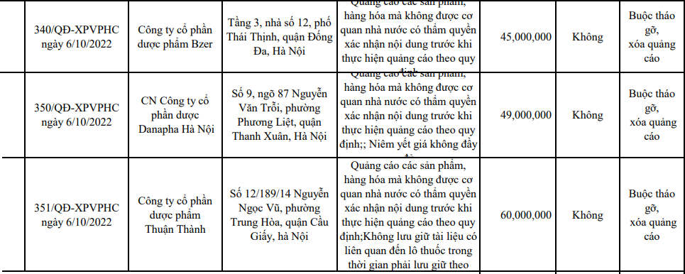 Sở Y tế Hà Nội vừa công khai danh sách xử phạt 16 cơ sở vi phạm hành chính (từ ngày 03/10/2022 đến ngày 07/10/2022) với tổng số tiền 456,000,000. Trong đó, có 3 công ty dược phẩm bị xử phạt do quảng cáo sản phẩm sai quy định.