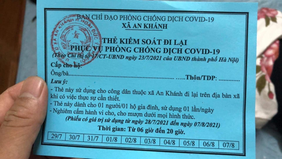 Vào ngày 28/7, xã An Khánh, huyện Hoài Đức cũng đã phát thẻ kiểm soát đi lại cho người dân. Thẻ này có giá trị sử dụng từ ngày 28/7 đến ngày 7/ 8 và được dùng để đi lại trong những trường hợp cần thiết
