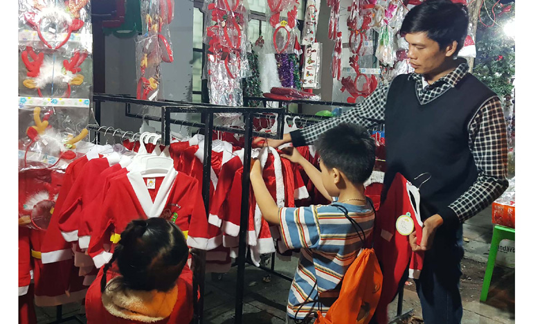 Các mẫu trang trí ông già Noel nhồi bông, ông già Noel hát và nhảy theo điệu nhạc, người tuyết nhồi bông giá từ 30.000-250.000 đồng/sản phẩm. Quần áo ông già Noel người lớn 150.000-450.000 đồng/bộ; quần áo ông già Noel cho bé trai 70.000-180.000 đồng/bộ; các mẫu váy đầm Noel cho bé gái 80.000-350.000 đồng/bộ. Đến thời điểm này, sức tiêu thụ các sản phẩm trang trí Noel rất tốt.