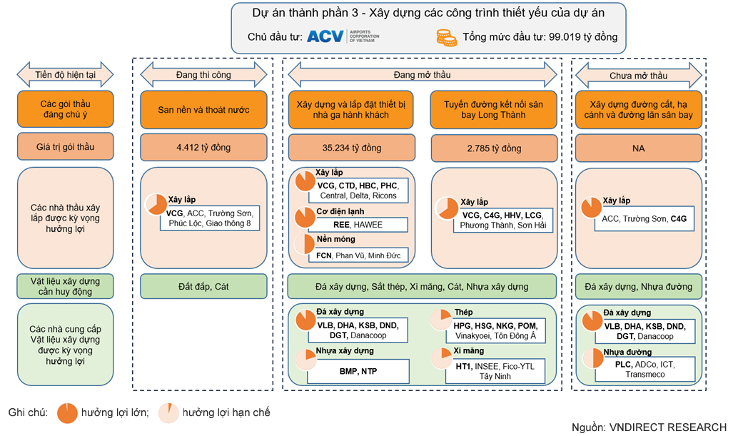 Trong dự án thành 3 của SBLT giai đoạn 1, VNDirect nhận thấy có 4 gói thầu đáng chú ý: gói 3.4 – thi công san nền và thoát nước; gói 5.10 - xây dựng và lắp đặt thiết bị nhà ga hành khách; gói 6.12 – xây dựng các tuyến đường kết nối sân bay Long Thành và xây dựng đường cất, hạ cánh và đường lăn sân bay. Các gói thầu còn lại chủ yếu có quy mô nhỏ hơn, bao gồm tư vấn giám sát, tư vấn lập thiết kế kĩ thuật, thi công tường vây, bảo hiểm công trình,…