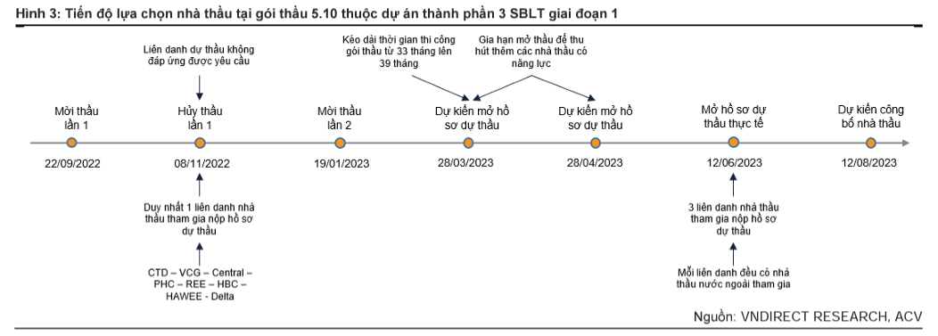 Theo đại diện của chủ đầu tư – ACV, đã có 3 liên danh nhà thầu nộp hồ sơ dự thầu (so với chỉ 1 liên danh của lần mở thầu đầu tiên). Đáng chú ý, cả 3 liên danh trên đều có tham gia của nhà thầu nước ngoài - với kinh nghiệm và năng lực thi công tốt - sẽ giúp gia tăng điểm thầu. Do đó, VNDirect tin rằng gói thầu quan trọng này sẽ tìm được nhà thầu và chính thức khởi công trong tháng 8/2023 (sau 2 tháng chấm thầu), tạo tiền đề giúp SBLT đẩy mạnh tiến độ thi công.
